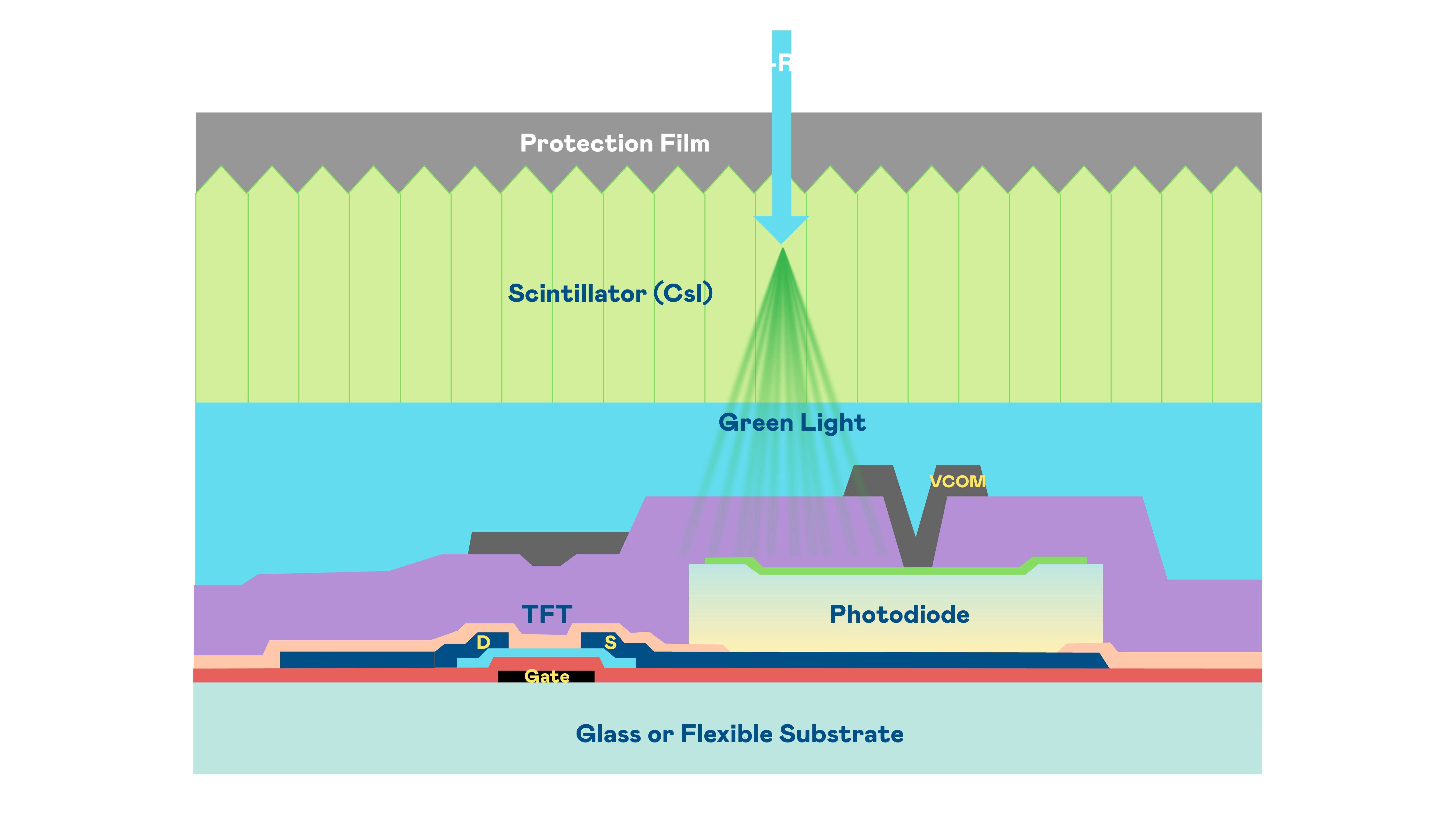 云鼎国际的X光影像感測陣列使用薄膜電晶體 (TFT) 作為每個像素的讀取開關,搭配光電二極體(Photodiode)的光電轉換元件,用以感測X光影像訊號。